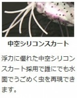 虫パターンのファイナルウェポンとして開発されたトップウォータールアー。 柔らかいが高い耐久性を誇るエラストマーボディに高浮力の発泡成型フロートを内蔵し、脚には浮力に優れた中空シリコンスカートを採用しているので、誰でも水面でうごめく虫を演出できます。 ボディのフロート内部にはバランスウェイトが組み込まれているので、浮きすぎず沈みすぎない絶妙な安定感を実現しています。 小型のフックやマスバリなどを頭部先端に上向きにセットしてご使用ください。 Length 30mm Weight 2.2g Type Floating ※2匹入り